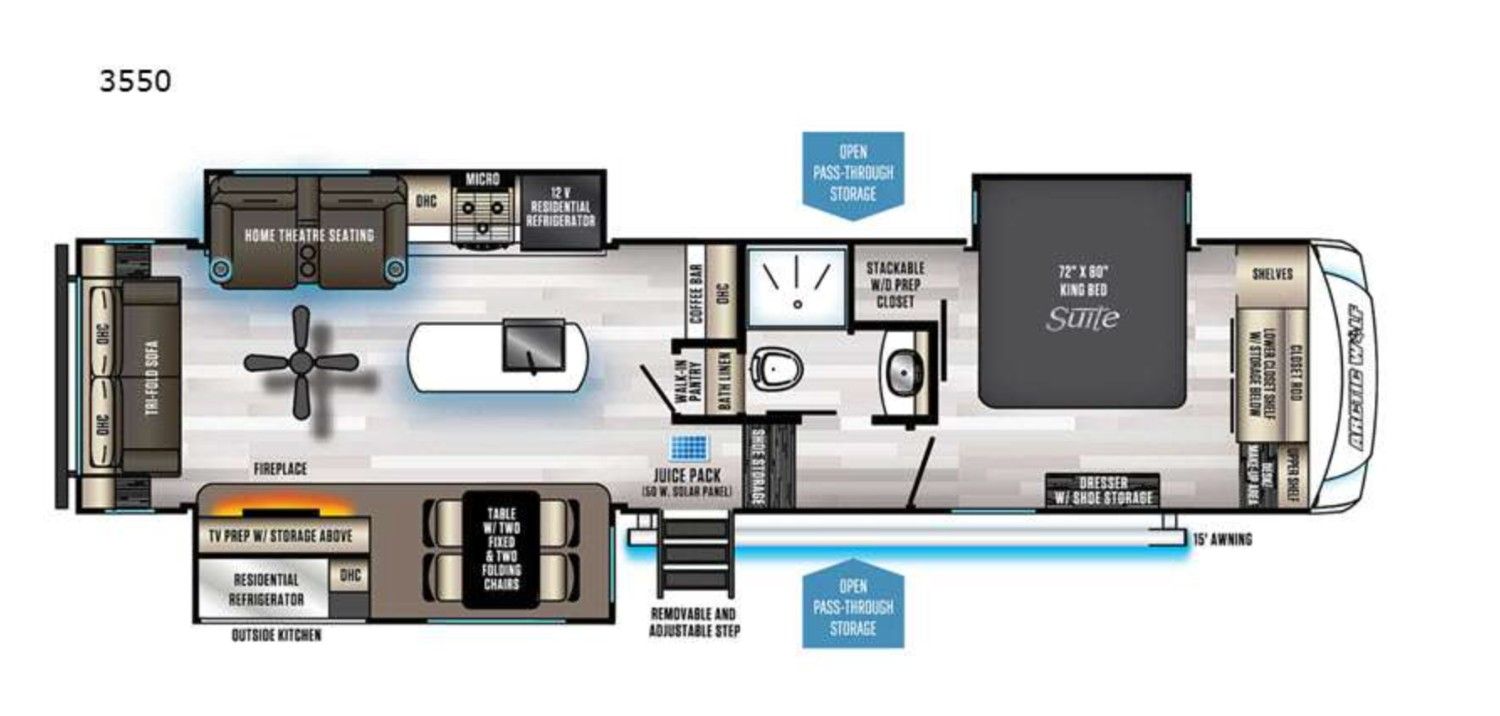 This Cherokee Arctic Wolf Suite fifth wheel is quite extraordinary and accommodating! It has a set of opposing slides in the main living area so that you can have more space to sit back on the theater seating and tri-fold sofa. You can switch on the fireplace to add some warmth to this space if it's a cool night, or if it is a hot afternoon, simply switch on the ceiling fan. The table with two fixed/two foldable chairs is going to be great for sitting down to eat a meal together, and after dinner, you can prepare coffee for everyone at the coffee bar. You'll also be able to grab dessert from the walk-in pantry to go with your coffee. The Juice Pack 50W solar panel will help your unit stay powered when you can't connect at a campsite, and the private bedroom up front is going to provide great relaxation with its king bed slide.