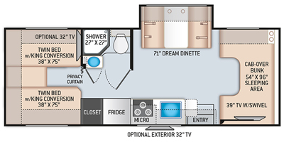 Details: Thor Motor Coach Four Winds Class C gas motorhome 25V highlights: Convertible Twin Beds Dream Dinette Slide Cab Over Bunk USB Charging Center 12V Refrigerator When you are ready to travel with your family or friends, this coach can be the perfect traveling companion! From the rear twin beds with a king conversion and a privacy curtain, to the slide out dream dinette and cab over bunk offering more floor space, you can be cozy with one more person or even a few more! The mid-coach full bathroom will keep you clean after a hike, and the kitchen amenities will keep everyone fed with warm meals and the ability to store leftovers in the 12V refrigerator. There is a 40" Smart TV on swivel over the cab area to watch your shows or games, and you might like to add the optional exterior 32" TV for outdoor fun. With any Four Winds Class C gas motorhome, you can travel in a trustworthy Ford E-Series chassis with 325HP, or a Chevrolet chassis with 401HP if you choose that option which is available on several models. Each is built with welded sidewall cage construction and a welded tubular aluminum roof, a one-piece fiberglass cap, and includes a slick fiberglass exterior with graphics package for style and years of enjoyment on the open road. Inside, you will enjoy the well-equipped kitchen, the spacious bathroom, the sleeping accommodations and the Winegard ConnecT 2.0 WiFi/4G/TV antenna that allows you to stay connected. With several floorplans to choose from and options to add, you will surely find one that fits your family's needs or your friend's approval. Choose today!