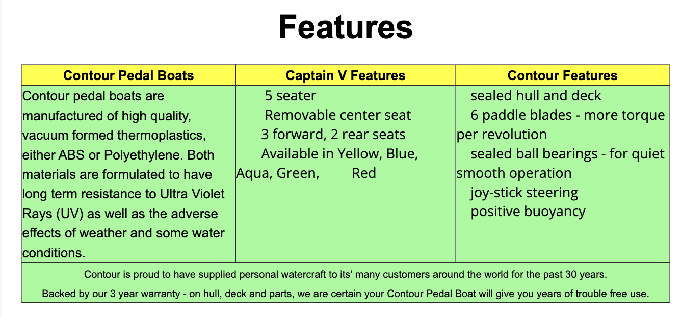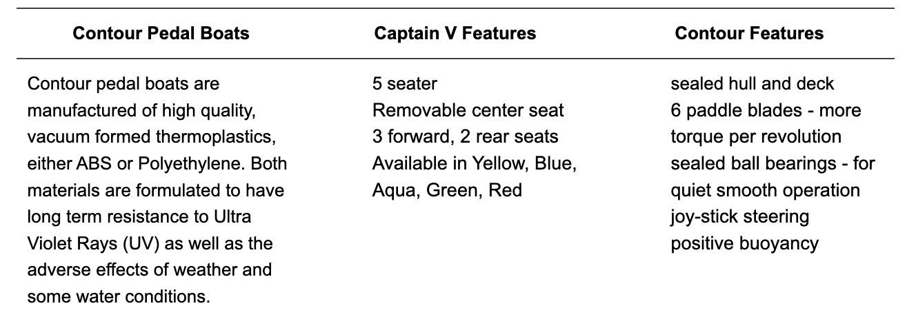 Features Contour Features Contour pedal boats are manufactured of high quality, vacuum formed thermoplastics, either ABS or Polyethylene. Both materials are formulated to have long term resistance to Ultra Violet Rays (UV) as well as the adverse effects of weather and some water conditions.