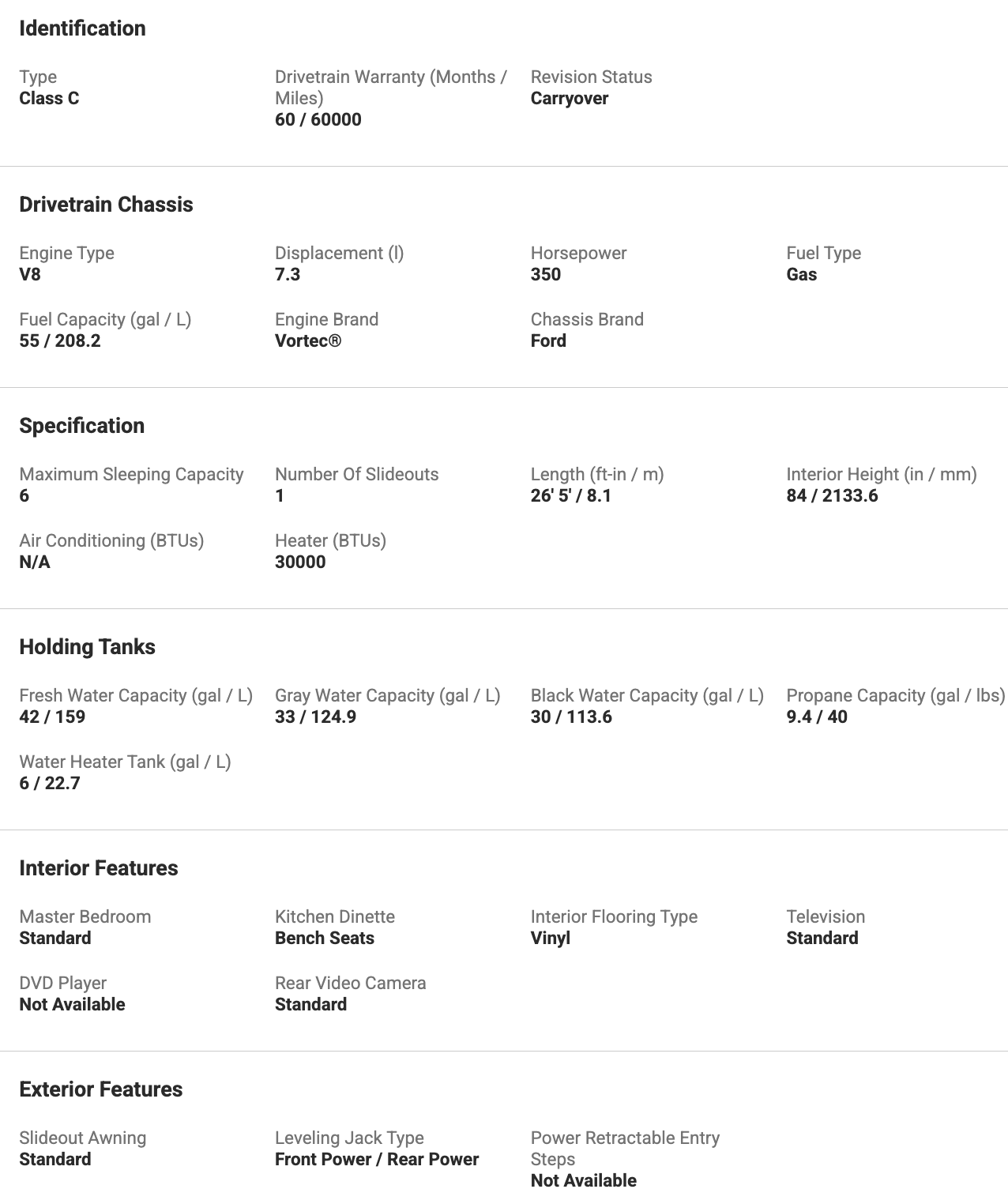 Details: Thor Motor Coach Four Winds Class C gas motorhome 25V highlights: Convertible Twin Beds Dream Dinette Slide Cab Over Bunk USB Charging Center 12V Refrigerator When you are ready to travel with your family or friends, this coach can be the perfect traveling companion! From the rear twin beds with a king conversion and a privacy curtain, to the slide out dream dinette and cab over bunk offering more floor space, you can be cozy with one more person or even a few more! The mid-coach full bathroom will keep you clean after a hike, and the kitchen amenities will keep everyone fed with warm meals and the ability to store leftovers in the 12V refrigerator. There is a 40" Smart TV on swivel over the cab area to watch your shows or games, and you might like to add the optional exterior 32" TV for outdoor fun. With any Four Winds Class C gas motorhome, you can travel in a trustworthy Ford E-Series chassis with 325HP, or a Chevrolet chassis with 401HP if you choose that option which is available on several models. Each is built with welded sidewall cage construction and a welded tubular aluminum roof, a one-piece fiberglass cap, and includes a slick fiberglass exterior with graphics package for style and years of enjoyment on the open road. Inside, you will enjoy the well-equipped kitchen, the spacious bathroom, the sleeping accommodations and the Winegard ConnecT 2.0 WiFi/4G/TV antenna that allows you to stay connected. With several floorplans to choose from and options to add, you will surely find one that fits your family's needs or your friend's approval. Choose today!